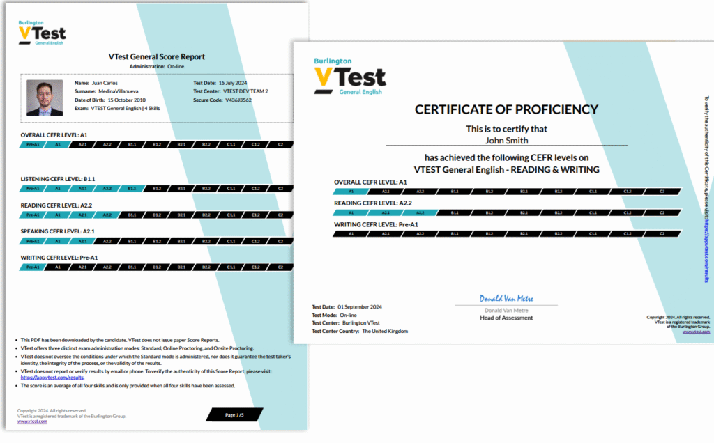 VTest General English es un examen online de inglés que mide de forma precisa tu nivel en las cuatro destrezas: Listening, Reading, Writing y Speaking. Está diseñado para candidatos de cualquier nacionalidad y está alineado con los niveles del Marco Común Europeo de Referencia (MCER), desde Pre-A1 hasta C2.